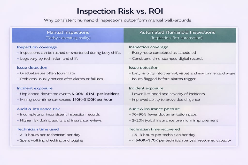 Humanoid inspections reduce operational risk by ensuring inspections are actually completed every shift, without shortcuts.